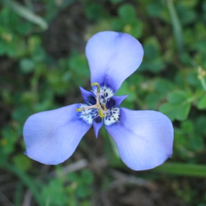 Flower: to 2 in. across with 6 segments. Three outer petallike segments, broad, wide-spreading, pale to dark blue or violet. Basal area heavily spotted with violet, outlined with purple. Flowers solitary or 2-3 at tip of leafless emerging from broad sheathing leaflike bract.
