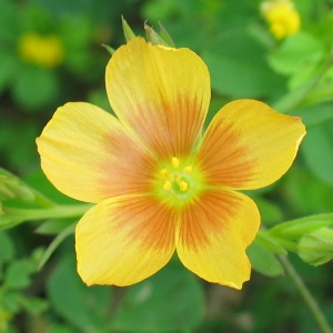Flower: To 1 1/8 in. across. 5 yellow to copper petals, often with reddish brown markins or dark reddish lines at base, cupped, swirled at bed, falling early. Flowers few, short-stalked, forming open terminal clusters.