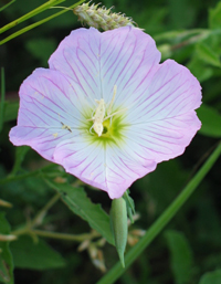 Four large, rosy-pink petals with darker red veins and a yellow basal spot. Petals white when bud opens, but quickly turn pink. Unopened buds nodding. Inferior ovary club-shaped. Leaves somehwat lobed or entire. 30-60 cm. |