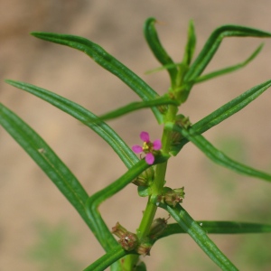 Flower: Small, stalkless cluster from the leaf axils. 1/8 in. across. Four deep pink to purple petals that drop early, leaving the persistent four-angled, toothed calyx.