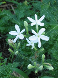 Long, tubular, trumpetlike, fragrant male flowers with stamens barely showing. Separate female (pistillate) flowers usually hidden in lowe part of inflorescene. Leaves deply divided into 5 lobes. Stems and leaves covered by numerous stining hairs. DO NOT TOUCH. Sting is severe and lasts for many hours. 10 cm - 1 m.