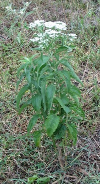 Leaves: 2-6 in. long, opposite, stalked, grayish green. Broadest near base, usually only 3 veined. Tapering at tip. Margins coarsely toothed. |