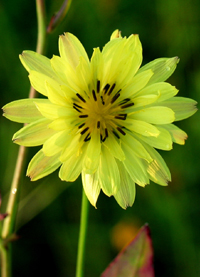 Bright yellow, half-dollar sized flowerheads consisting entirely of ray flowers. Upper stem leaves with 2-3 pairs of pinnate lobes. Flowerhead buds with an outer row of short, linear bracts. Milky sap. 20-80 cm. Forms giant masses of yellow. |