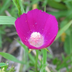 Flower: 1-2 in. across five violet to red-violet (occasionally white) petals, cup shaped at first opening out nearly flat as flower matures. Stamens and pistil form a conelike structure in the center of the flower.