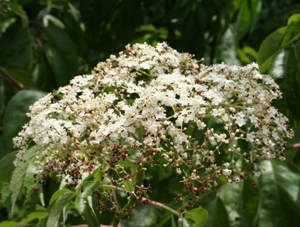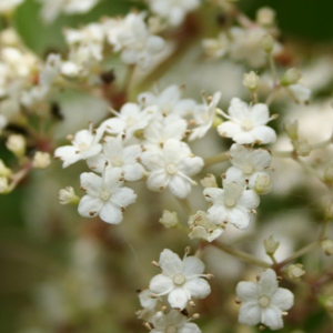 Flower:Multiple tiny flowers arranged in large convex or flattened heads with combined width of 4-10 inches across. Each flower is creamy white about 1/4 in across, trumpet shaped, ending in 5 petal like lobes.