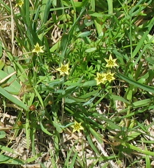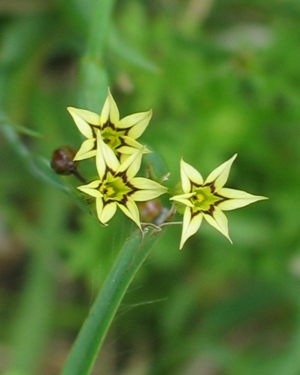Flower: Six small similarly shaped yellow tepals. Fflowers solitary or in small umbel-like cluster. Three stamens (lillies have 6) and inferior ovary.