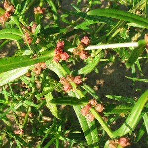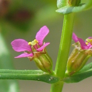 Flower: Small, stalkless cluster from the leaf axils. 1/8 in. across. Four deep pink to purple petals that drop early, leaving the persistent four-angled, toothed calyx.