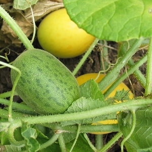 Fruit: up to 3 in. in length and 2 in. in diamter. Bright yellow with brown mottling when mature. Extremely strong, musky odor.
