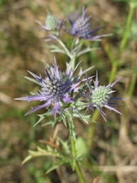The flower heads, bracts and stamen are purple. The flower grows on short stems in the fork of the branches. The deeply lobed leaves surround the stems, clasping it. A tuft of small, rigid, spiny leaves grows out of the top of the flower head. |